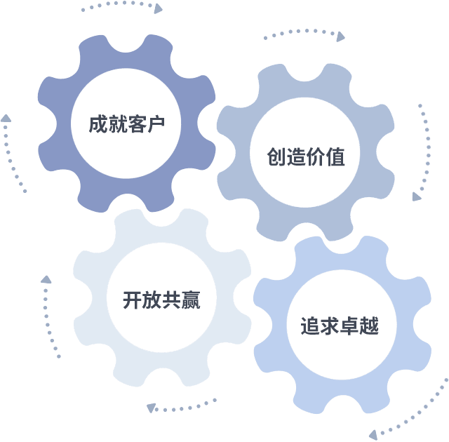成就客户是一切决策的出发点,,,,创造价值是衡量所有工作的标准,,追求卓越是我们做事做人的态度,,开放共赢是我们的格局也是最终的结果。。。。价值观的齿轮环环相扣,,,,推动着组织里的每个人不断向前。。。。